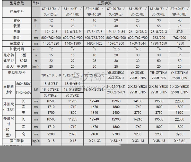SB隔爆型軌輪式梭式礦車是地下煤礦平巷掘進的新型高效出渣運輸設備。有8m3 、14m3 、20m3 等多種規(guī)格,分別用于小、大型斷面的平巷掘進使用。這種梭車來往于工作掌子面到料場之間,像穿梭一樣完成繁重的出渣任務,它本身依靠別的機車拖動分別在600mm、762mm、900mm軌距的軌道上運行。